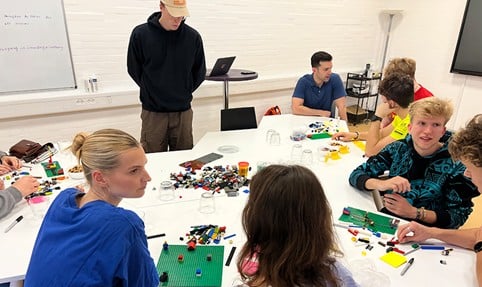 Lego og Theo Kæregaard fra IBOS’ ungekursus hjælper studerende på DTU Skylab med at udvikle nye taktile løsninger til Nordeuropas største musikfestival.